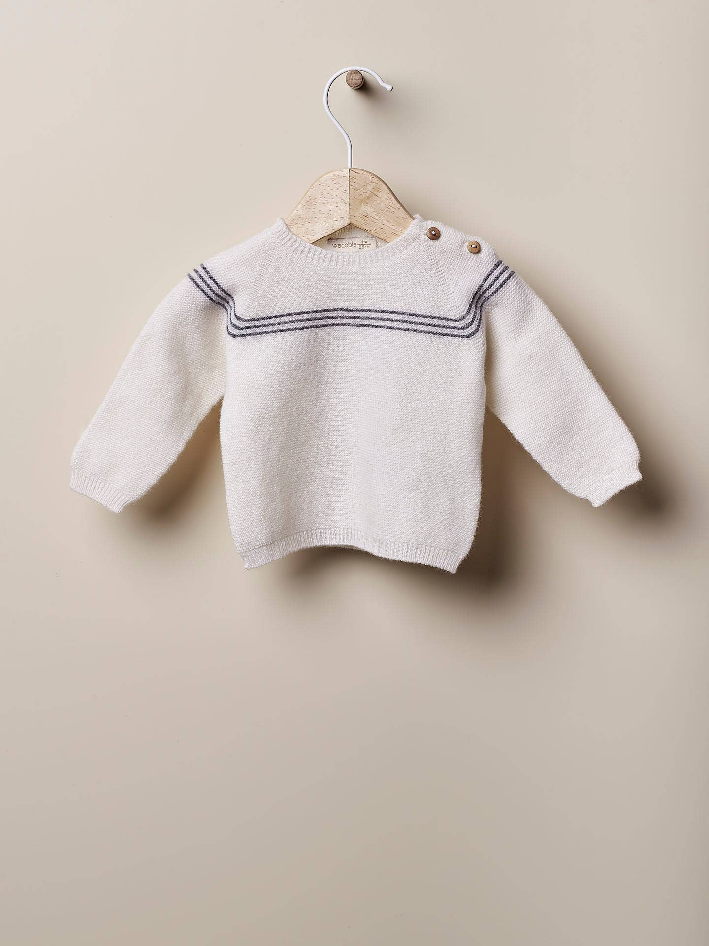 Sweater knitted from soft extra fine merino wool, great for baby boys and girls. LOVE ON WINTER DAYS long-sleeved sweater fastens on the shoulder with wooden buttons. Made with Wholegarment technology, this piece is seamless for your baby's maximum comfort.